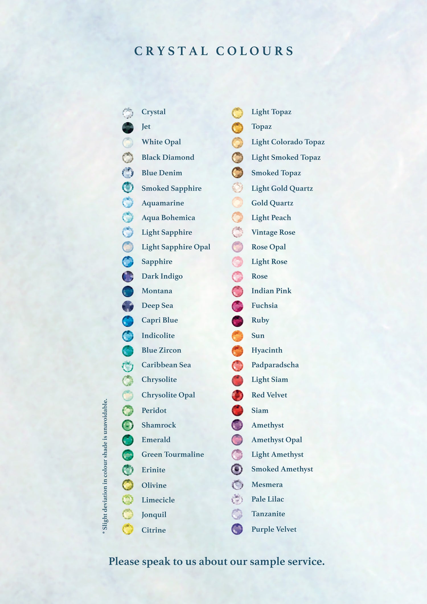 We have tried to replicate the colours of our crystals as closely as possible. To be sure, we would encourage you to send us a swatch of your fabric where possible, so we can colour match for you before going ahead with your design.